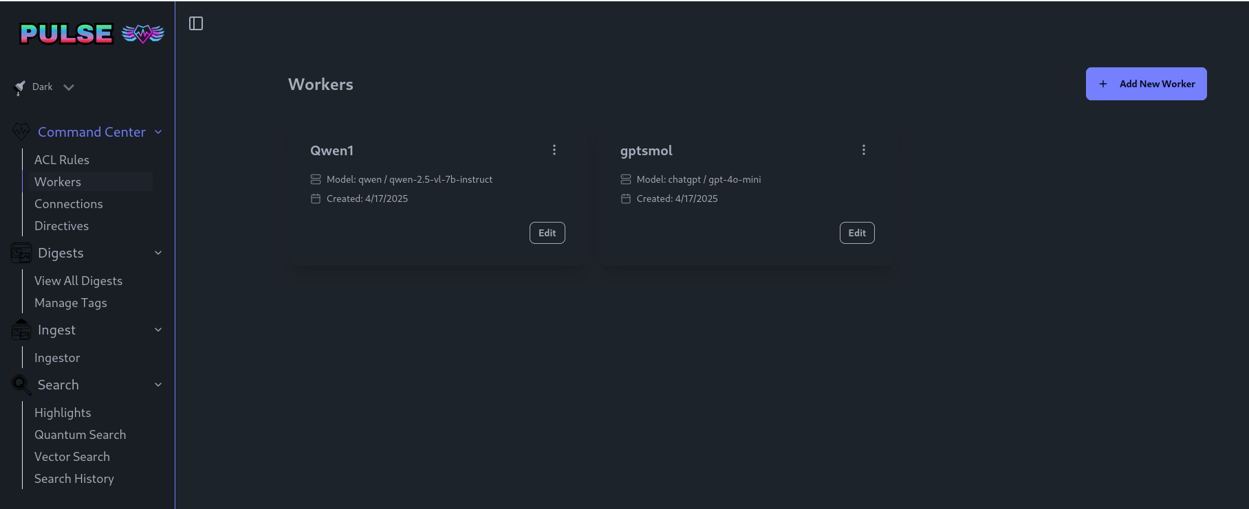 Workers are AI models that carry out tasks within Pulse based on your custom-defined ACL (Access Control List) rules. Each worker interprets these rules and performs tasks such as summarization, search processing, entity extraction, or content transformation.