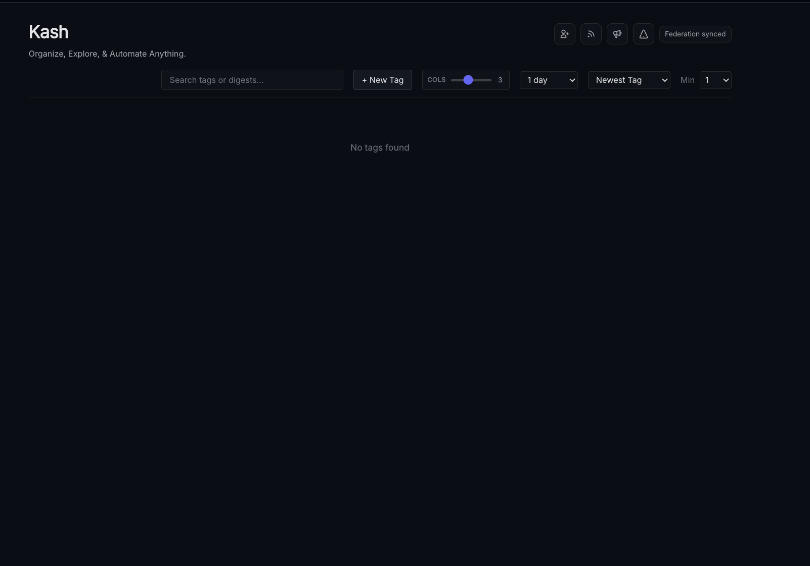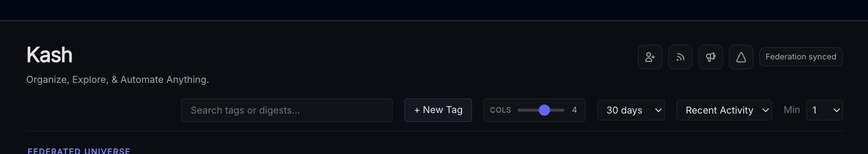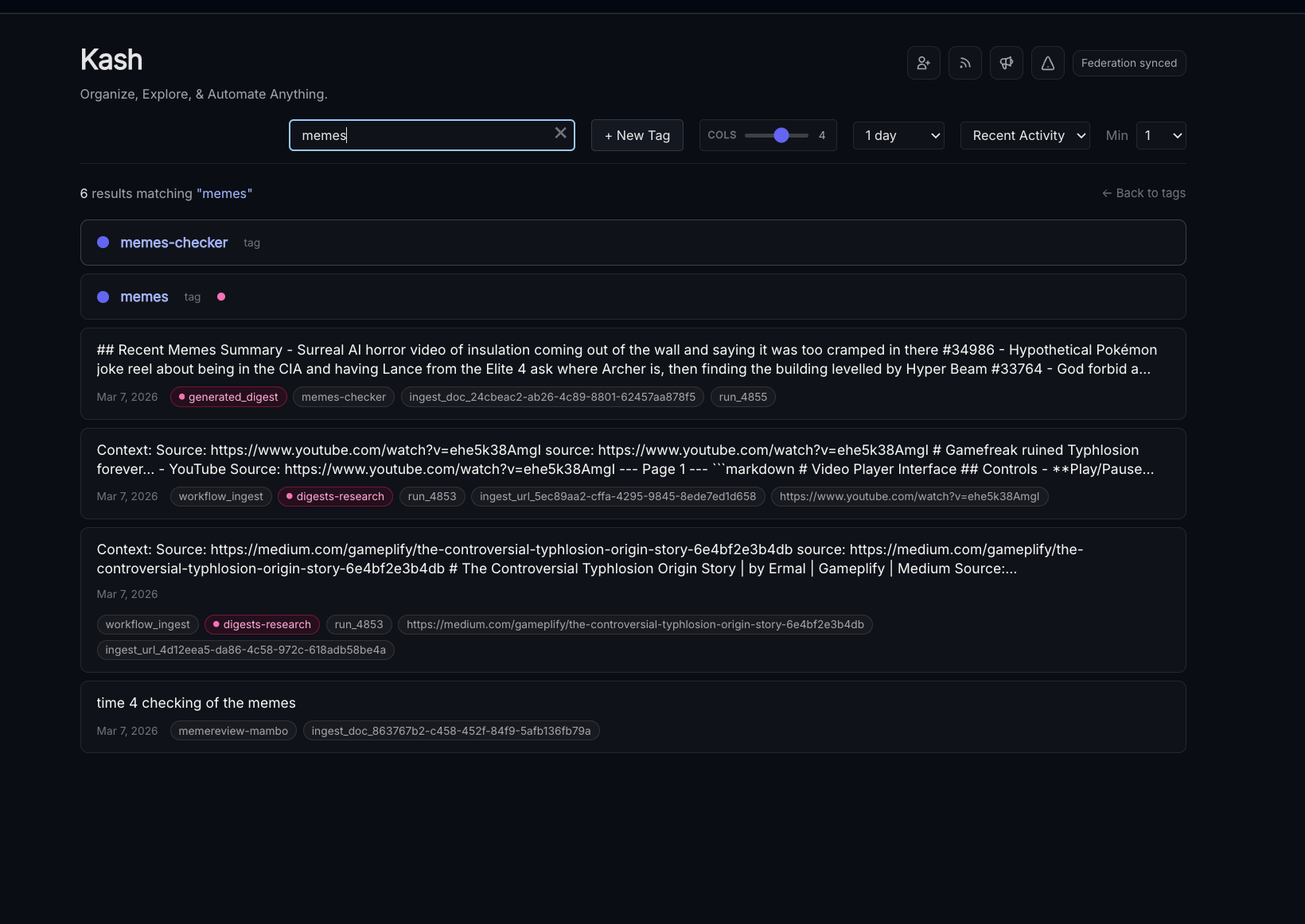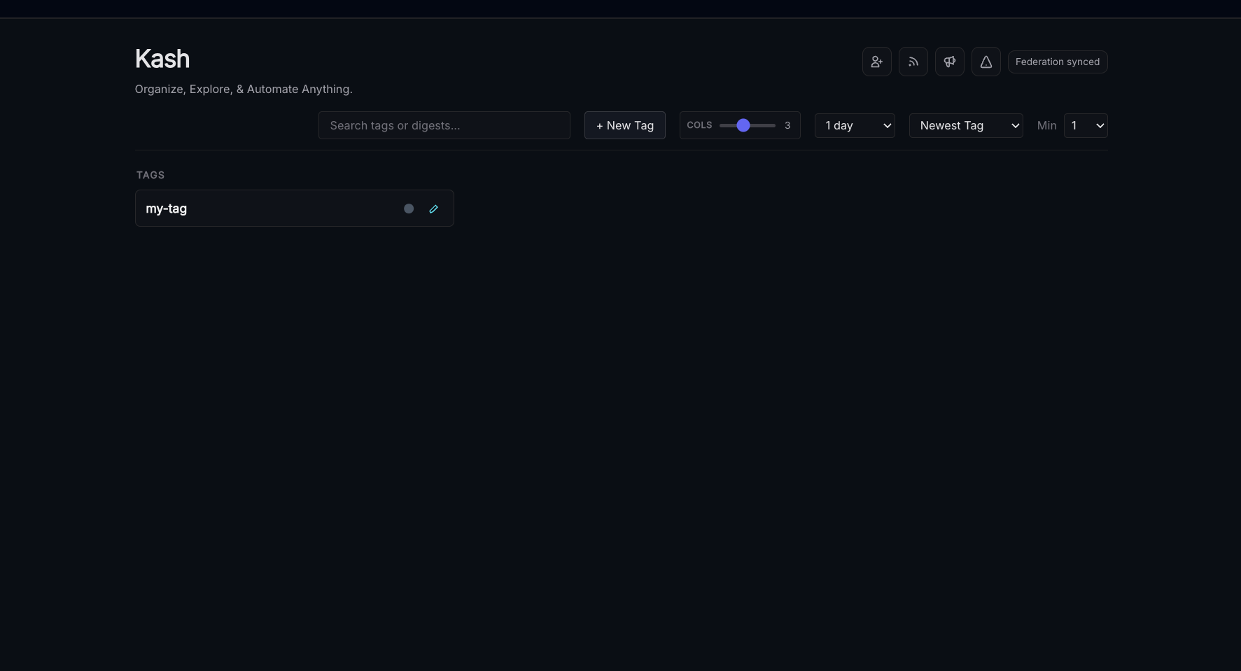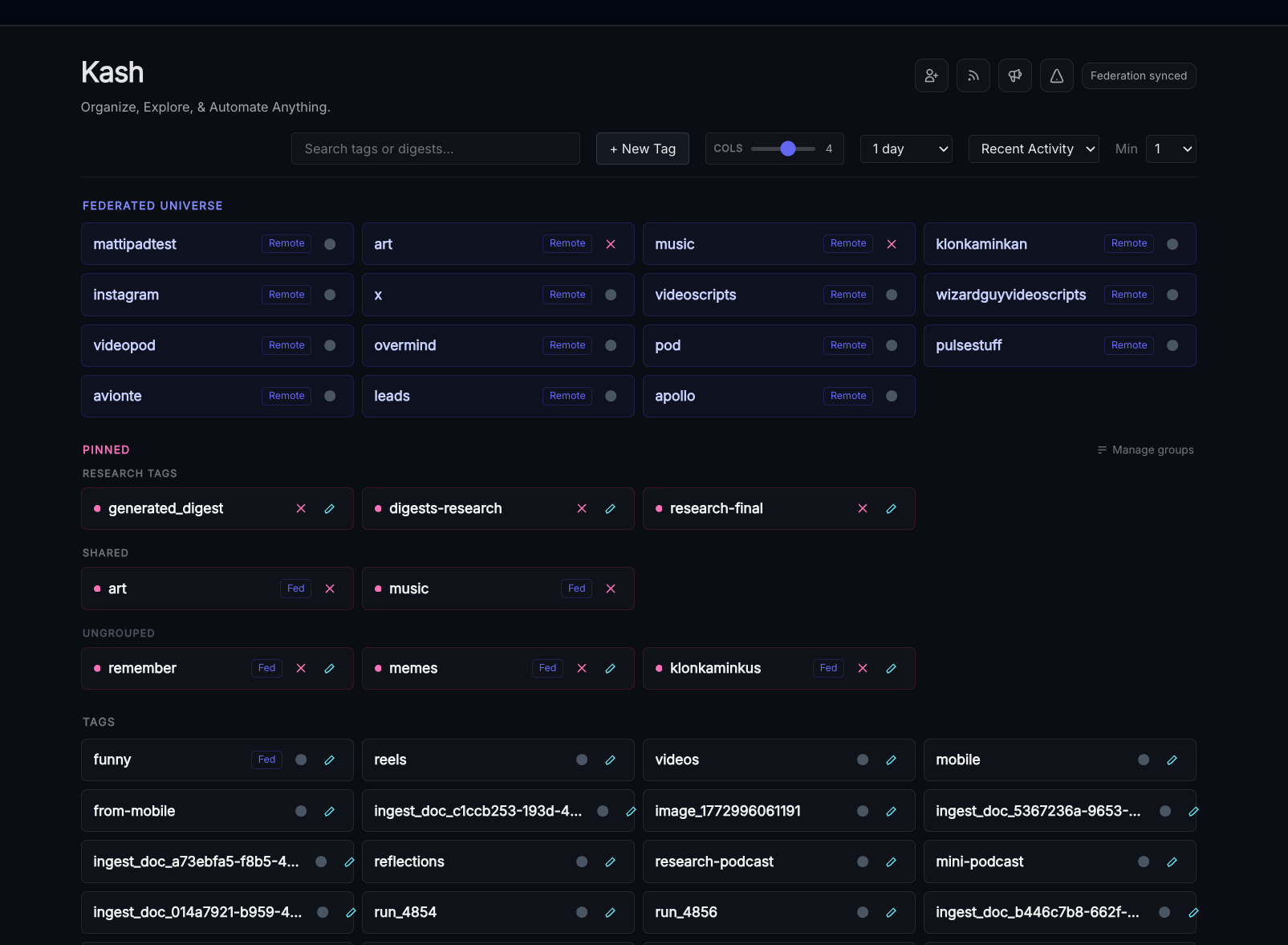 Tags can be pinned, grouped, and searched over in the main Kash page - here's an example from a more "mature" node.