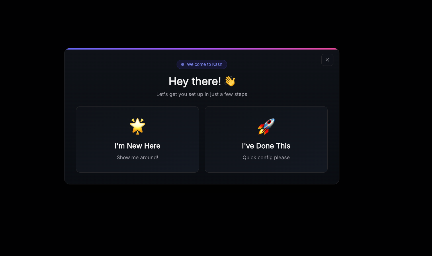 Many users find the blank Kash page intimidating - think of it as a blank canvas for your data - if for some reason you don't immediately see the tutorial pop up you can access it by clicking the triangle icon in the top-right corner.