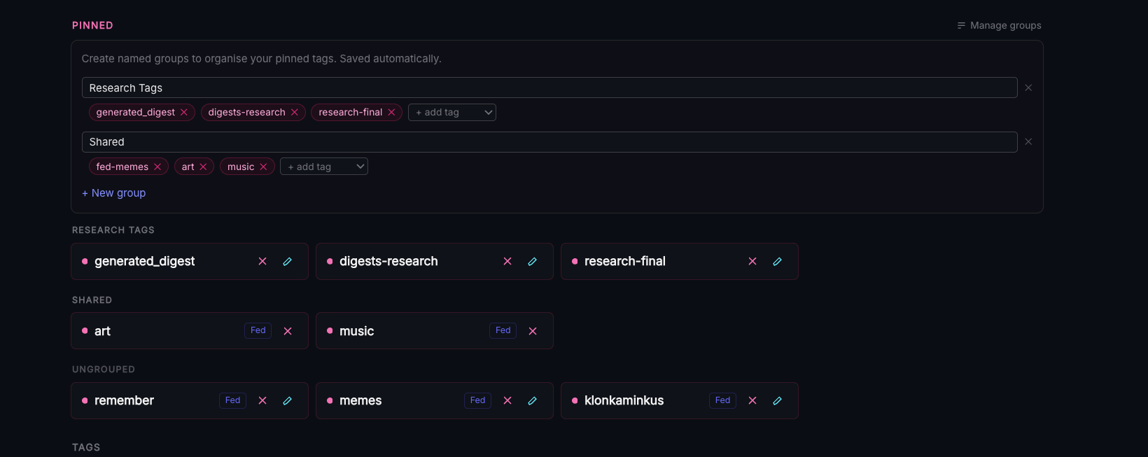 Federated tags are always displayed at the top for easy access, the round grey icon on the right edge of each tag is used to pin. Groups can be controlled from the "manage groups" tab, which expands when clicked.