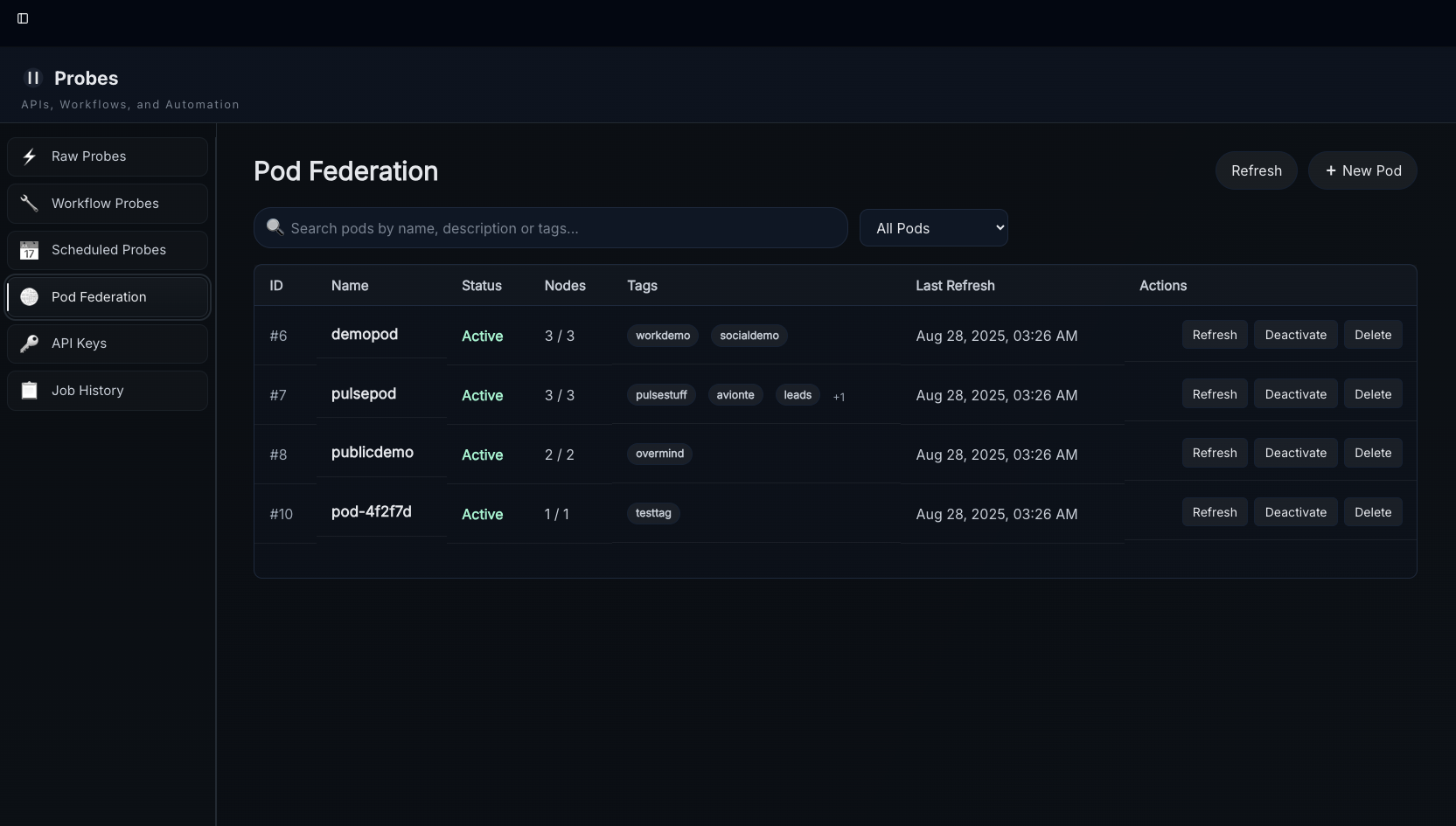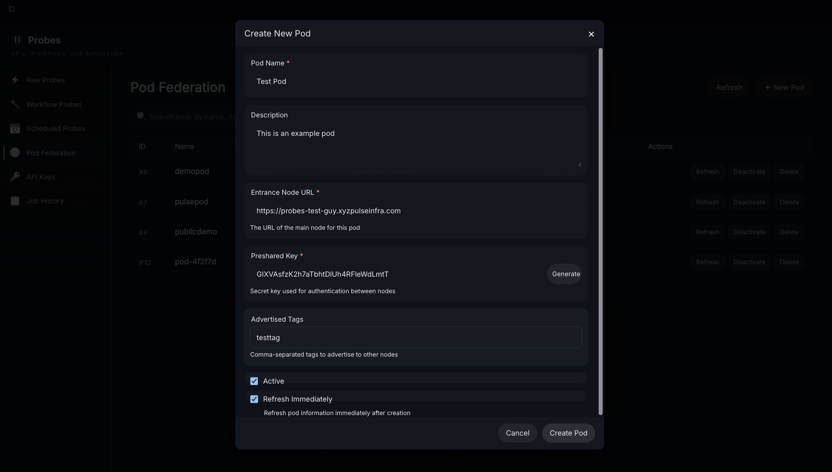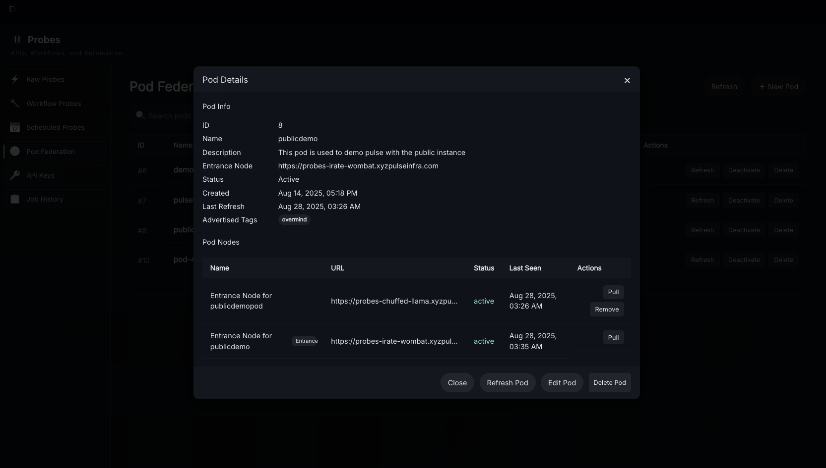 NOTE: Pod federation occurs through the "probes" API bastion for your node. You MUST prefix the URL you use for nodes with "probes-". Ex: if your node name is "angry-lemur" your url is "https://probes-angry-lemur.xyzpulseinfra.com" this protects your node from most exploits that require direct access and rate limits requests from other nodes so that they don't impact your experience.