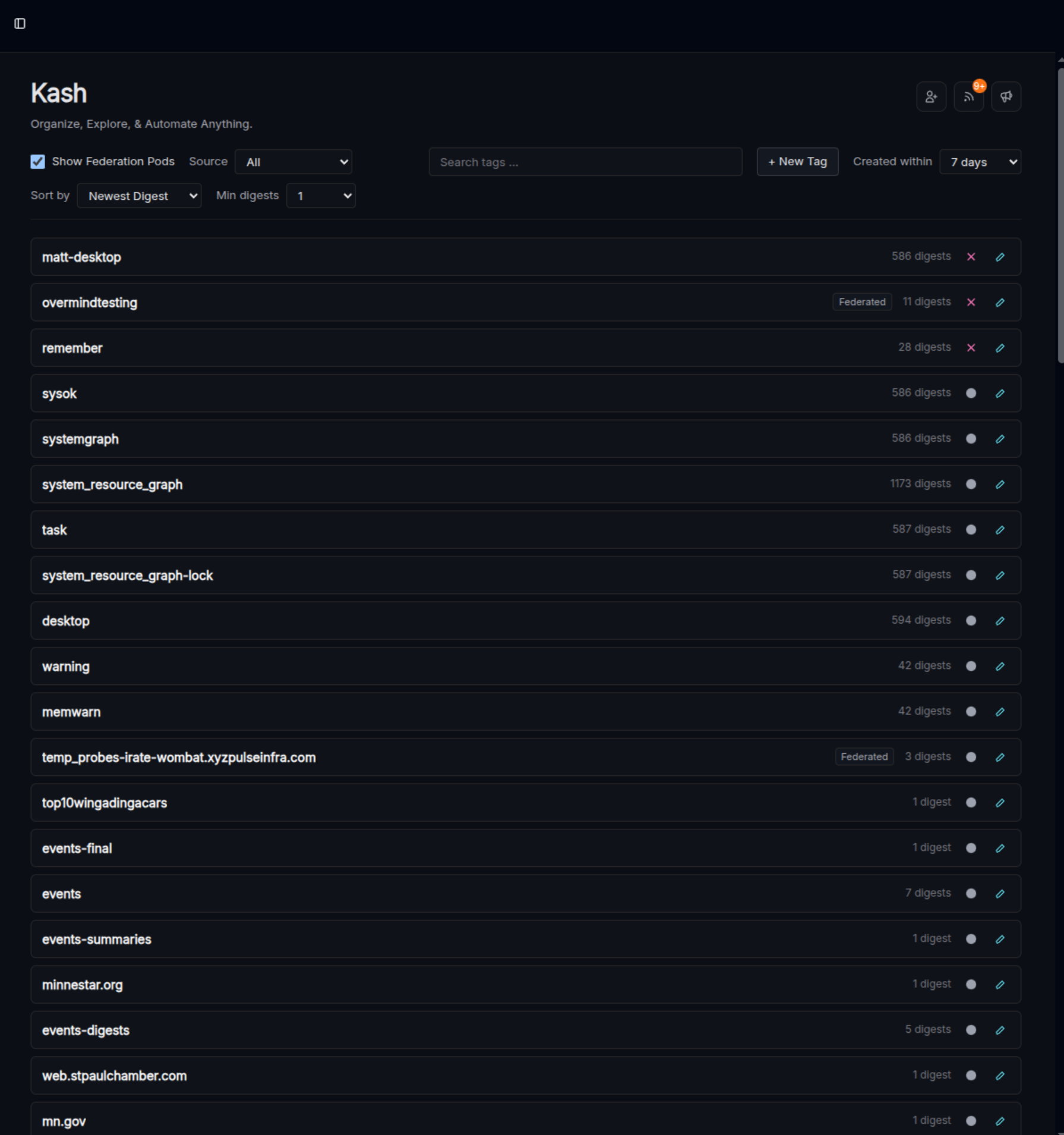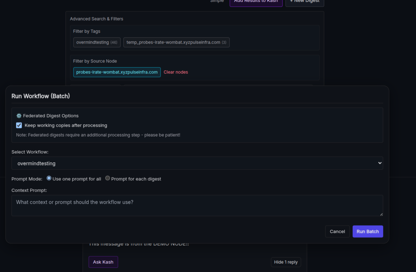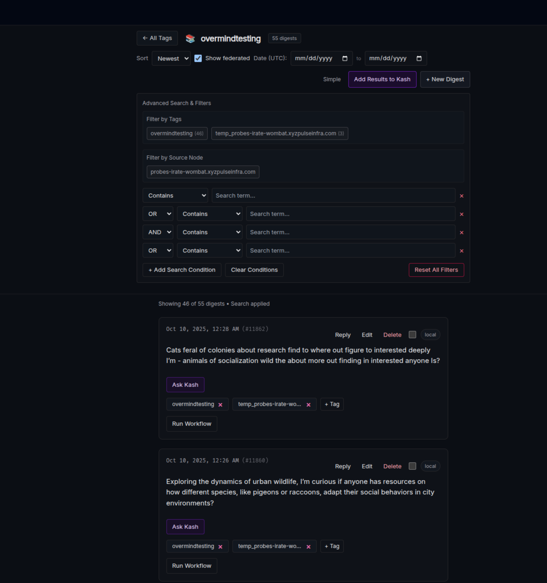 The updated tags page has far more options for filtering and search than the previous version. You can now filter by date, tag, node, and conditional logic based on digest contents. It is now also possible to run workflows on digests from federated nodes: