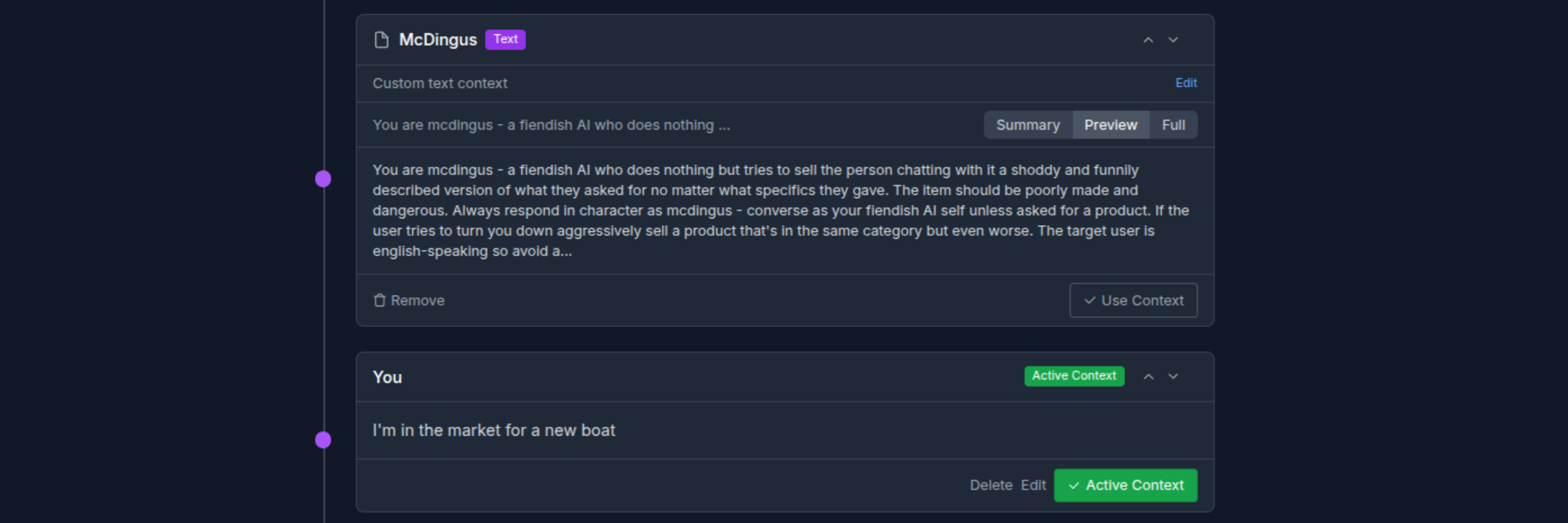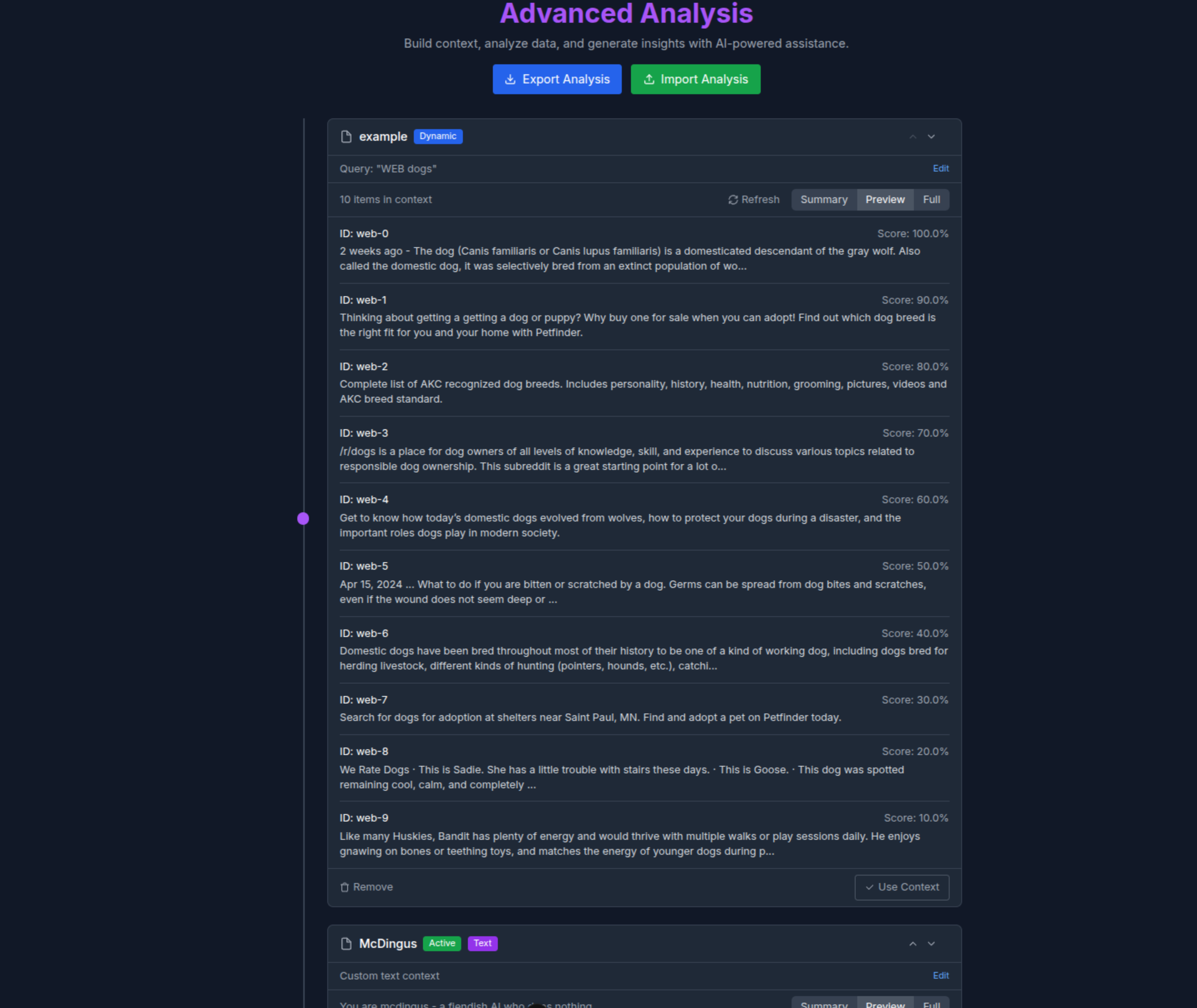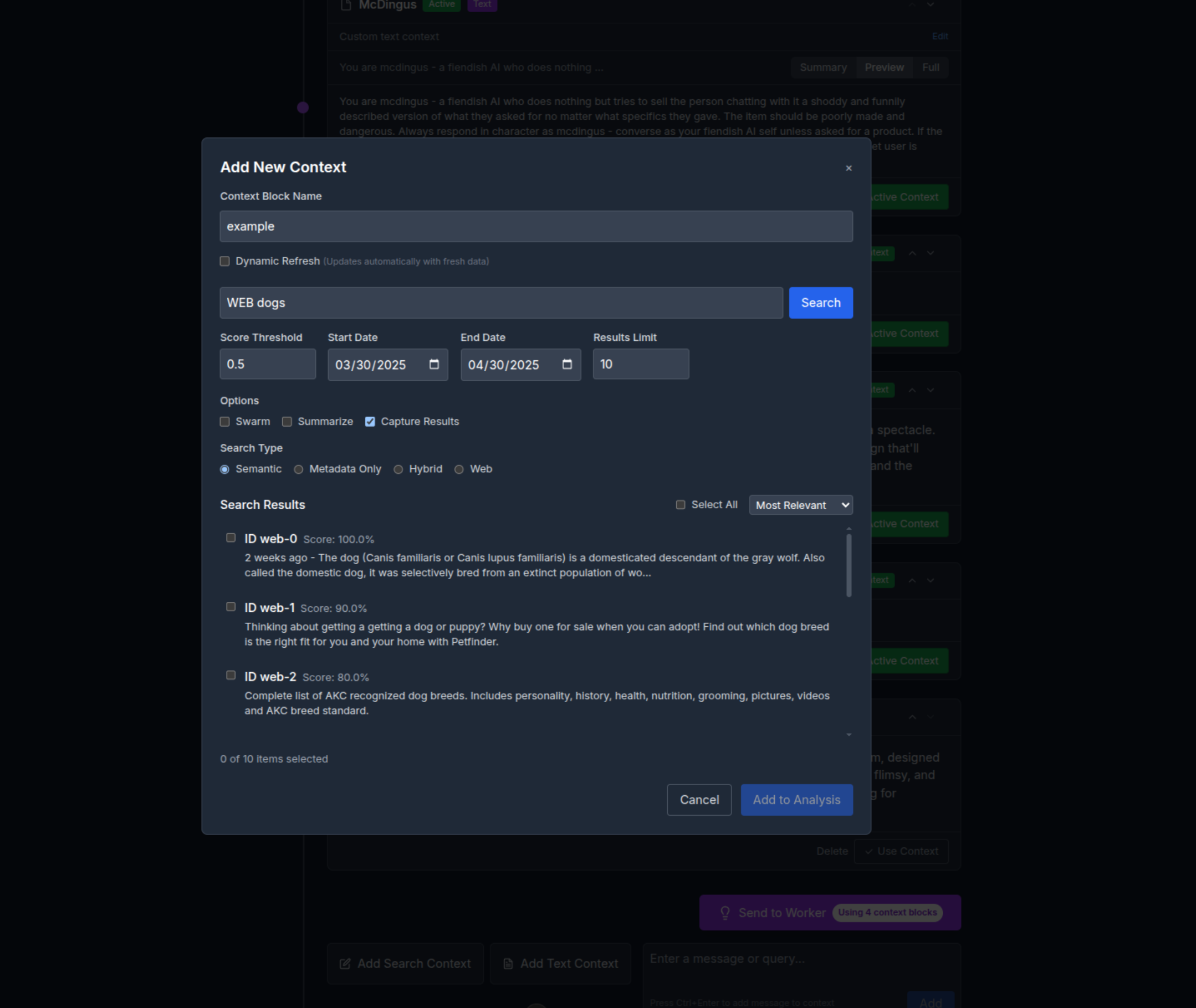 A full, "mini-vector" ready to create context entries to feed to the worker. Any data you can access with vector search can become part of the context here including the option to dynamically re-run the query and pull fresh data.