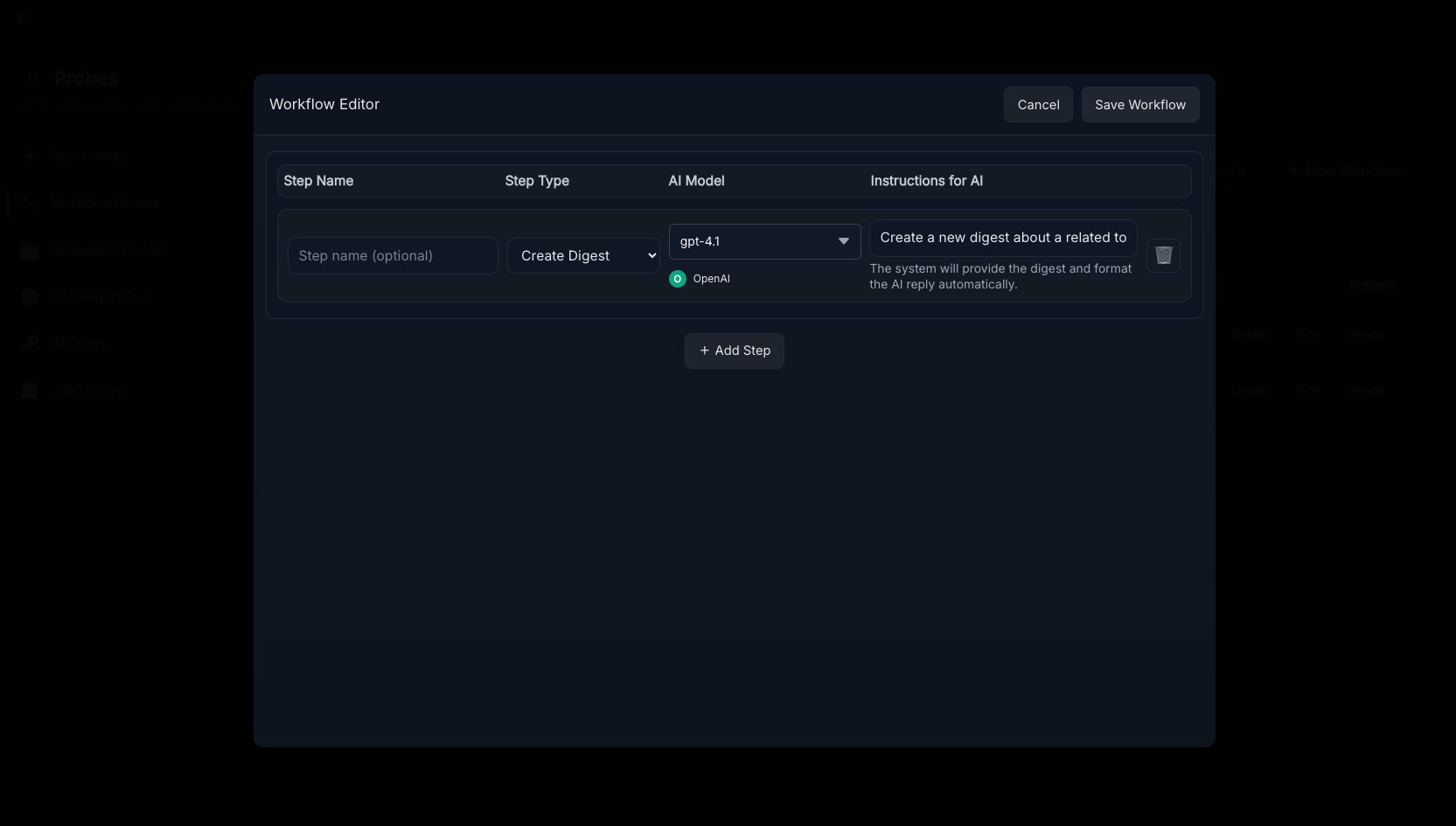 Workflows allow you to manage digests with Natural Language. To create a workflow follow these steps after navigating to the Workflow Probes page: