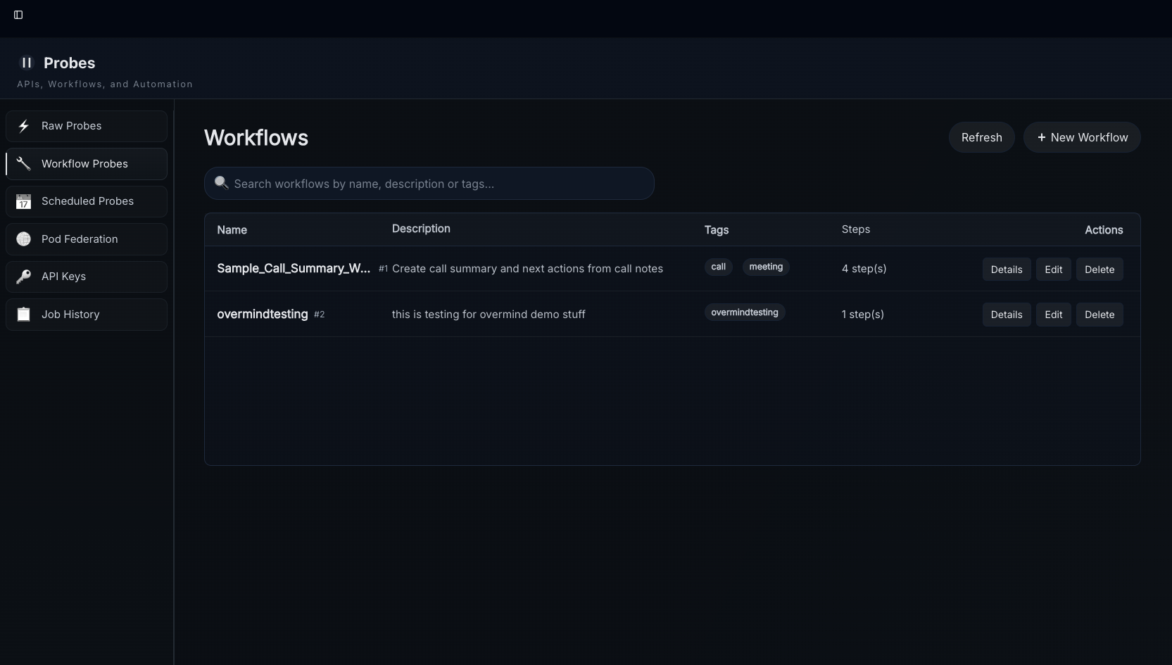 To create a workflow (if not using the assistant) follow these steps after navigating to the Workflow Probes page by clicking "probes" in the sidebar and then...