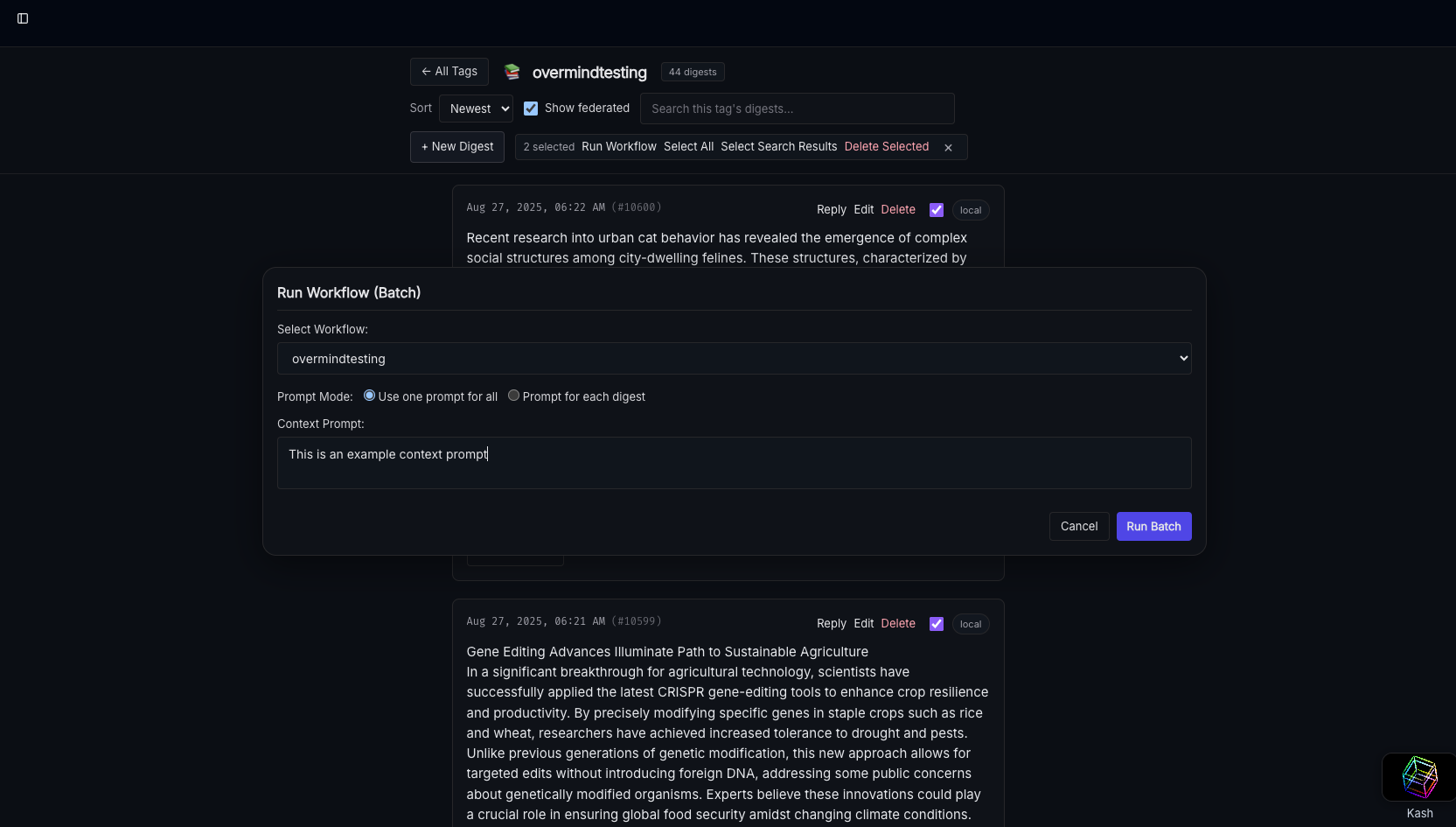 5.) Navigate to the tag in Kash and select digests to run the workflow - in the UI you can run workflows for any digest regardless of tag, tags only apply to new incoming digests so you can assign no tags to make something a UI-only workflow