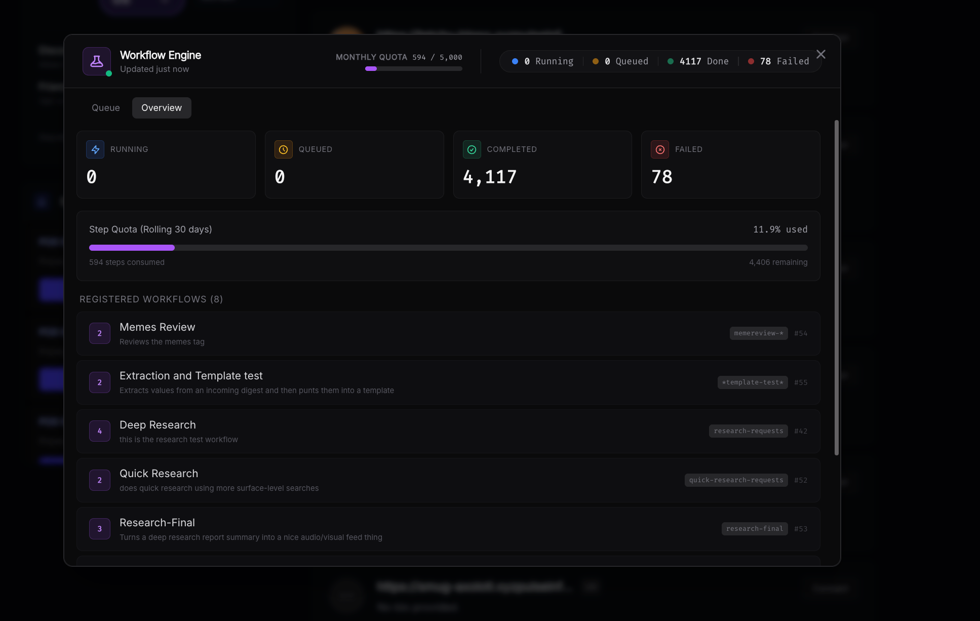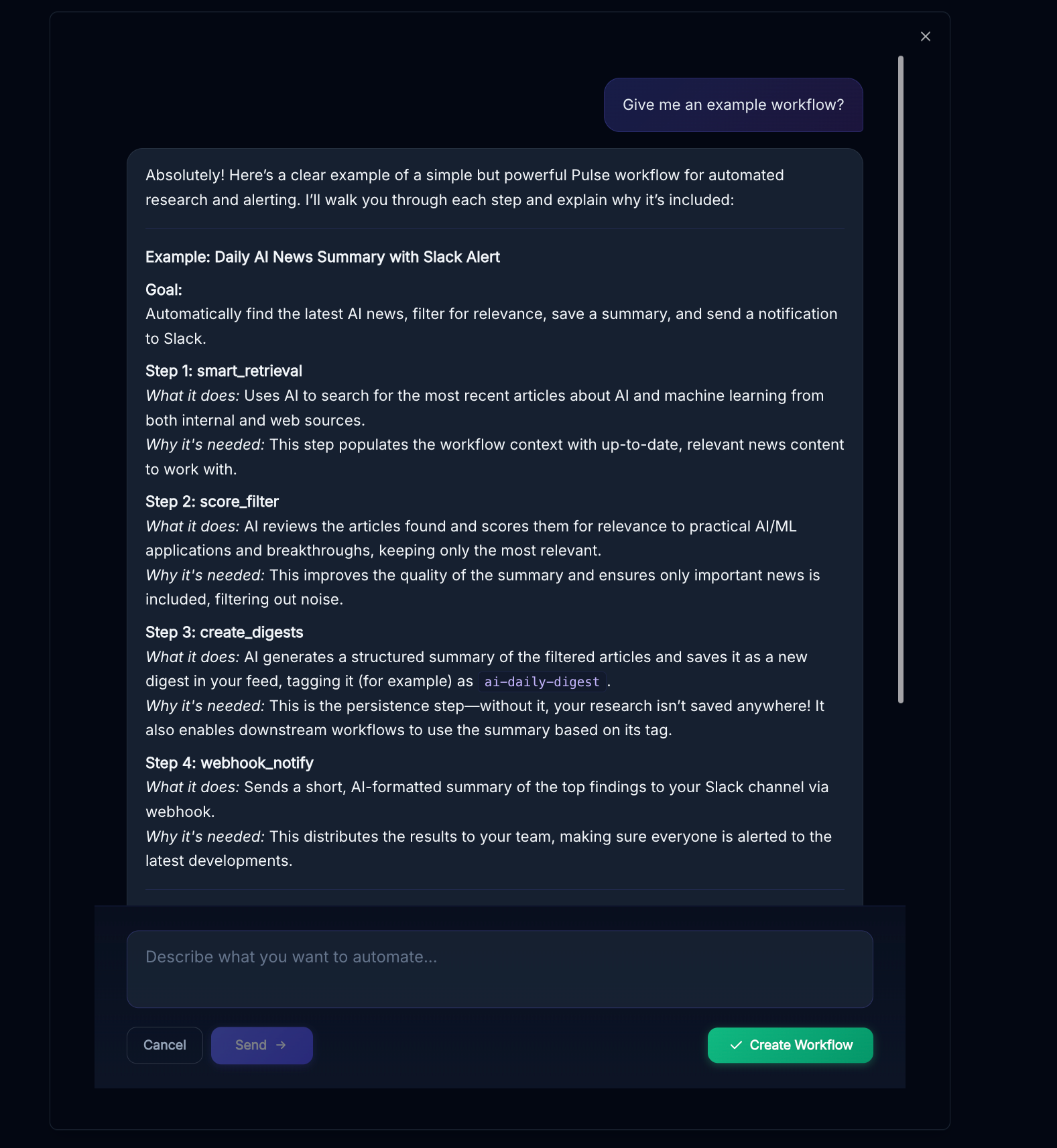 Workflows allow you to manage digests with Natural Language. Workflows will run automatically on any ingested content with matching tags, including digests generated by other workflows. We'll start this off with a general guide and provide a more detailed guide with information about all of the step types at the end.